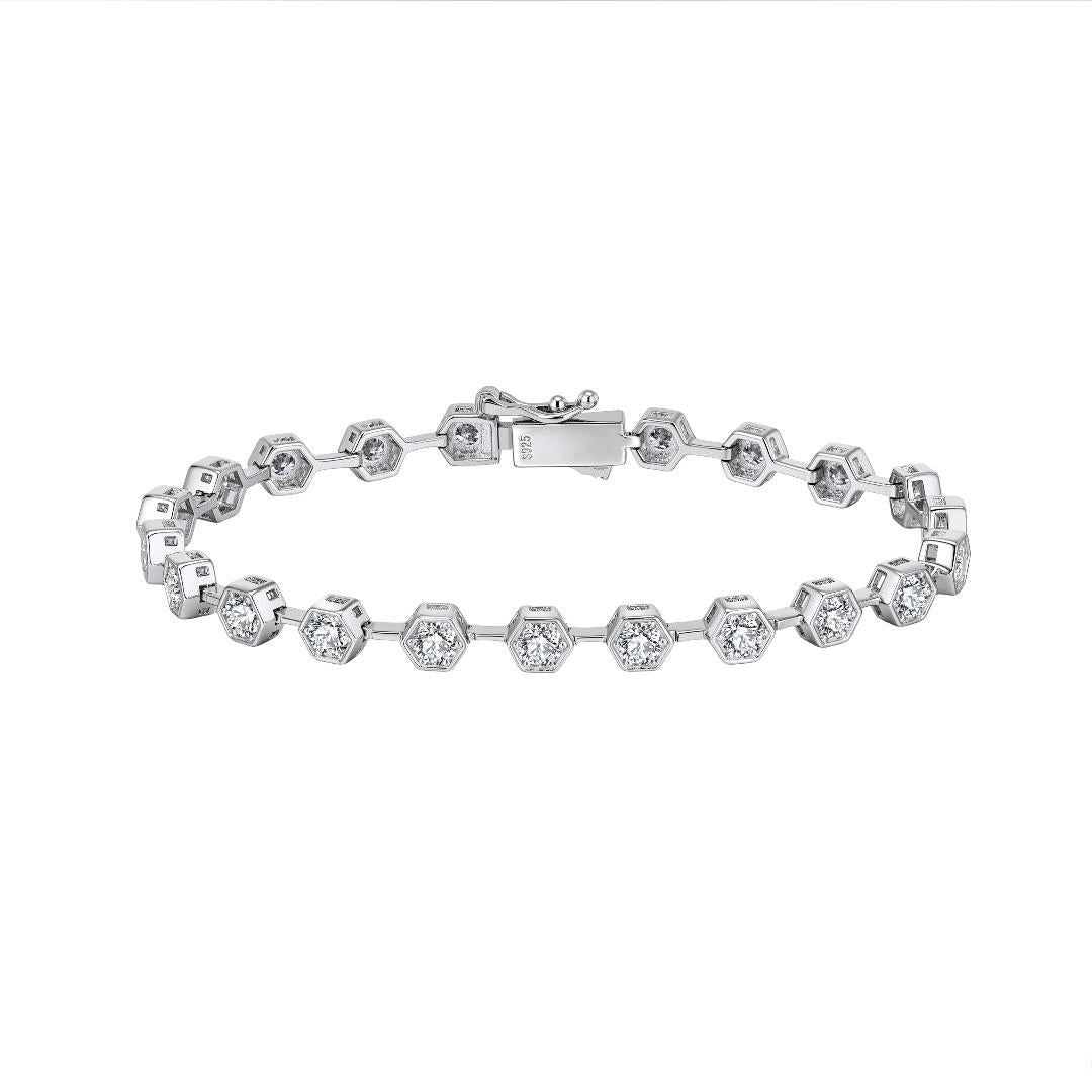 - Timeless Elegance, Inspired by Royal Style Elevate your jewelry collection with the Ello Elli Simulated Moissanite Tennis Bracelet — a stunning piece inspired by the timeless sophistication of a royal fashion icon. Crafted from genuine 925 sterling silver, this bracelet features brilliant lab-created moissanite gemstones in a unique hex bezel setting for a modern, refined twist.