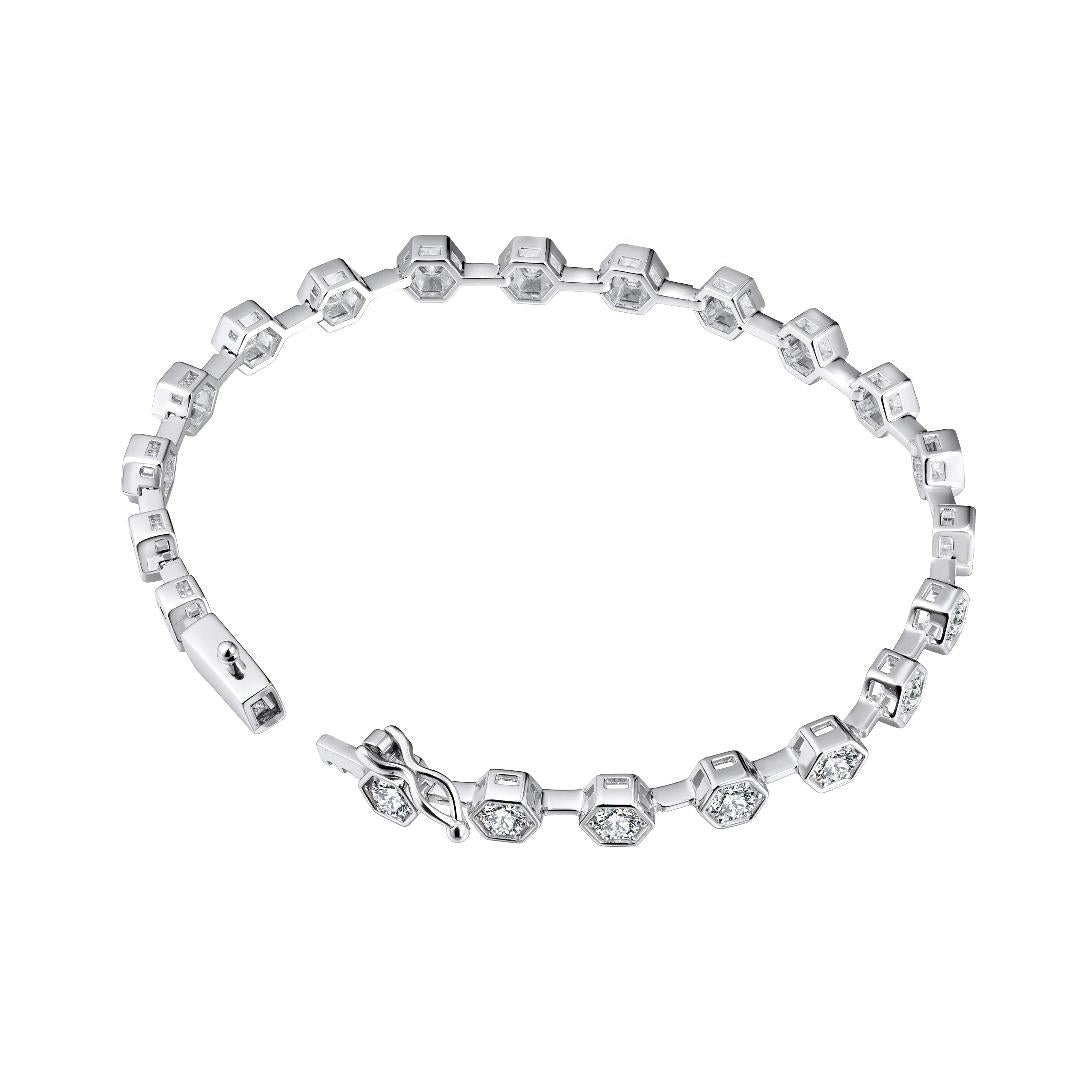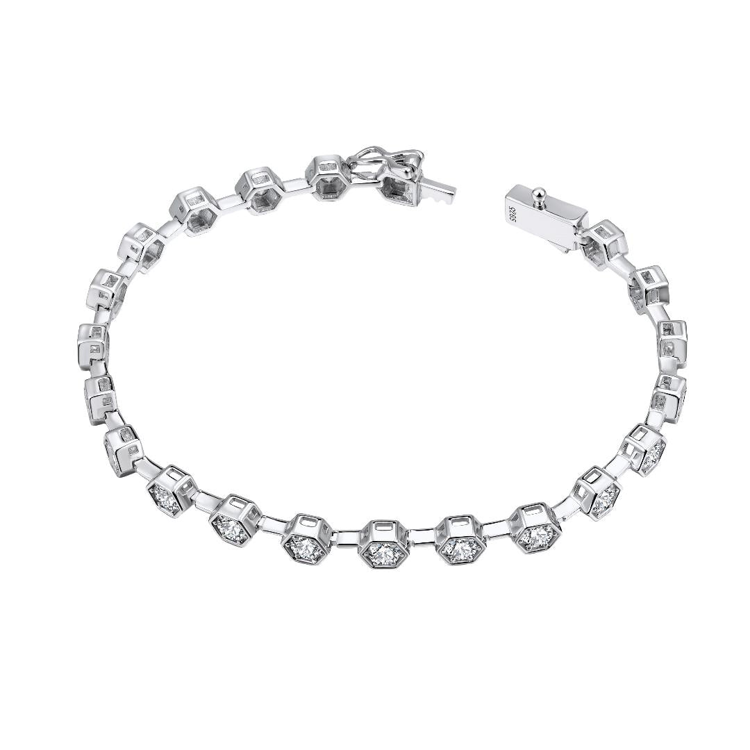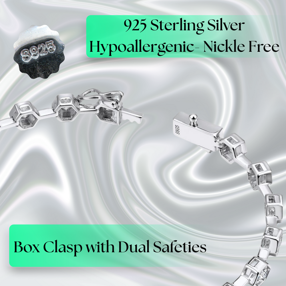 - Product Details: Material: 925 Sterling Silver, Stones: 2.5mm Simulated Moissanite Setting: 4.5mm Hexagon Bezel Clasp: Box Clasp with Button + Buckle Safety Length: 7 Inches Packaging: Premium Green Jewelry Gift Box